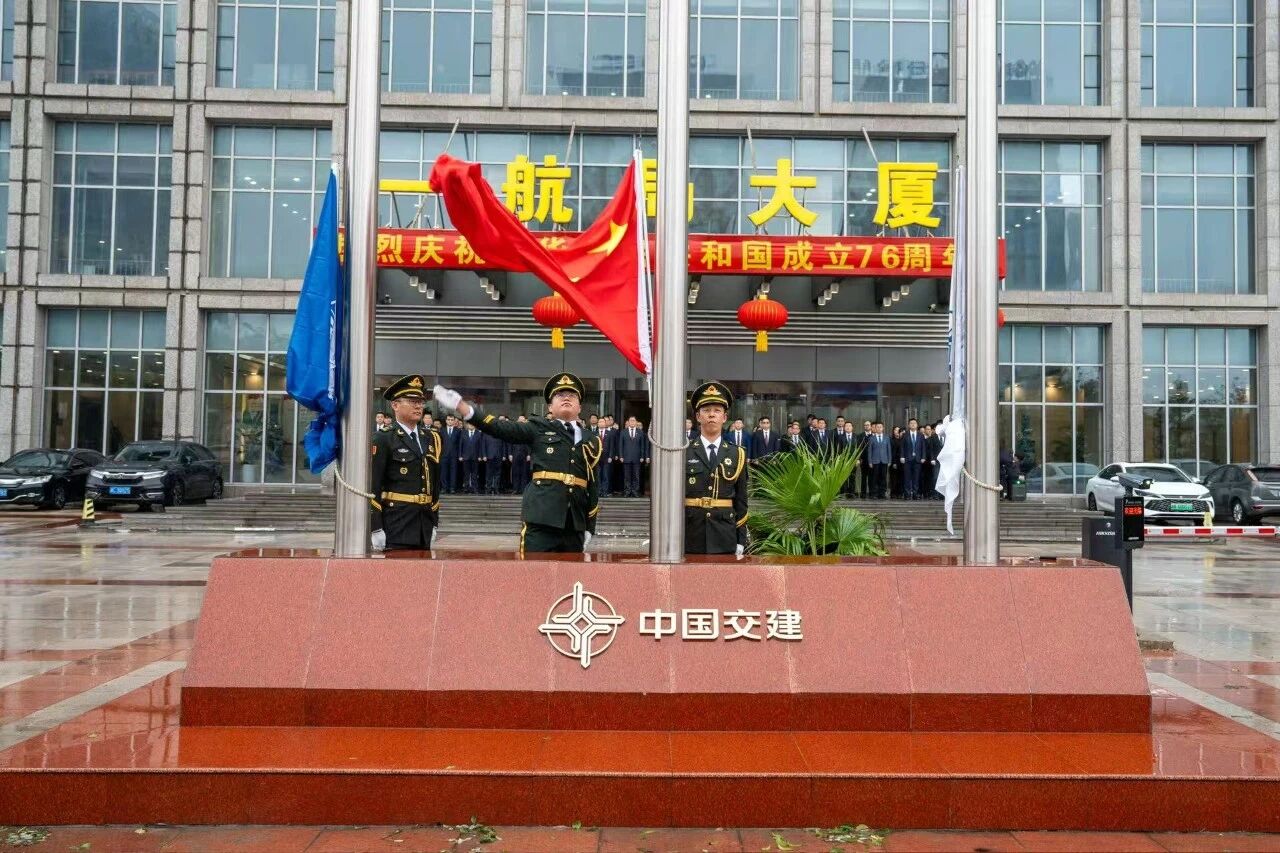 国歌毕,《歌唱一航》的旋律奏响,中国交建司旗缓缓升空,与五星红旗一同在细雨中迎风飘扬,展现着一航人扎根企业、报效祖国的坚定信念。